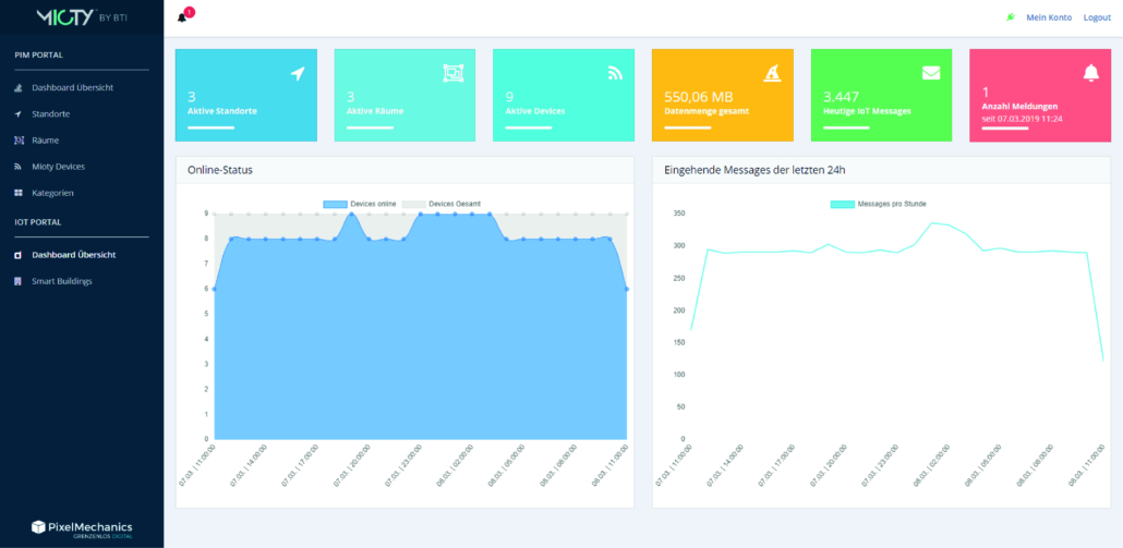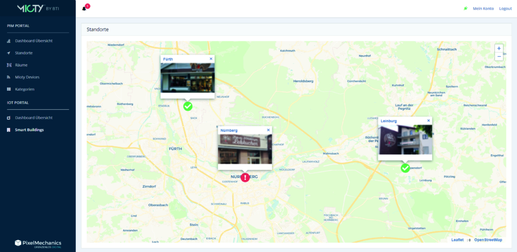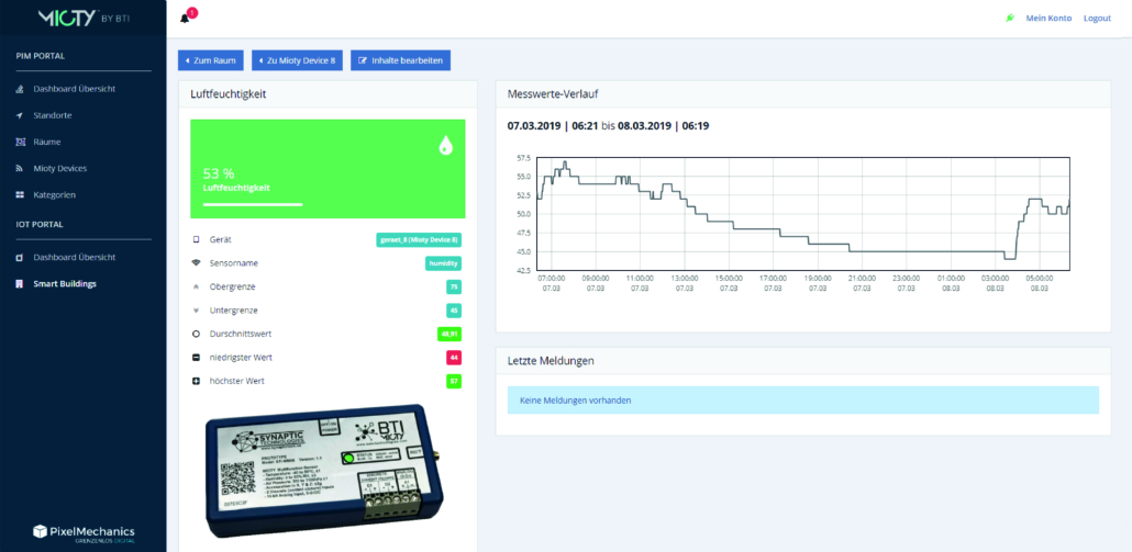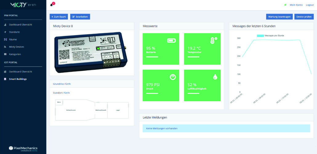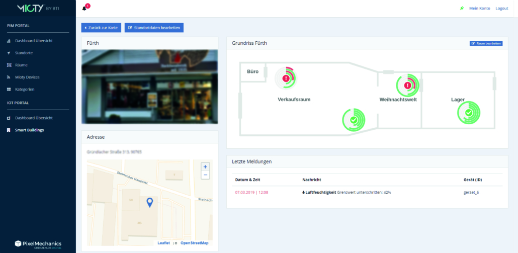 Mit der Installation der Geräte in den Räumen der drei Shops, können wir nun verschiedene Messwerte aufnehmen und visualisieren. Für die unterschiedlichen Räume wurden eigene Grenzwerte hinterlegt, die sich über einen längeren Zeitraum qualitativ auf die Ware auswirken. Wird ein Grenzwert unter- oder überschritten, erfolgt in Echtzeit eine Warnmeldung im IoT Portal und es können direkt Maßnahmen wie Nachregulierung der Heizung oder zusätzliche Luftzufuhr in die Wege geleitet werden. Darüber hinaus gibt es die Möglichkeit aus dem IoT Portal heraus die Wartung des jeweiligen Gerätes zu beantragen.